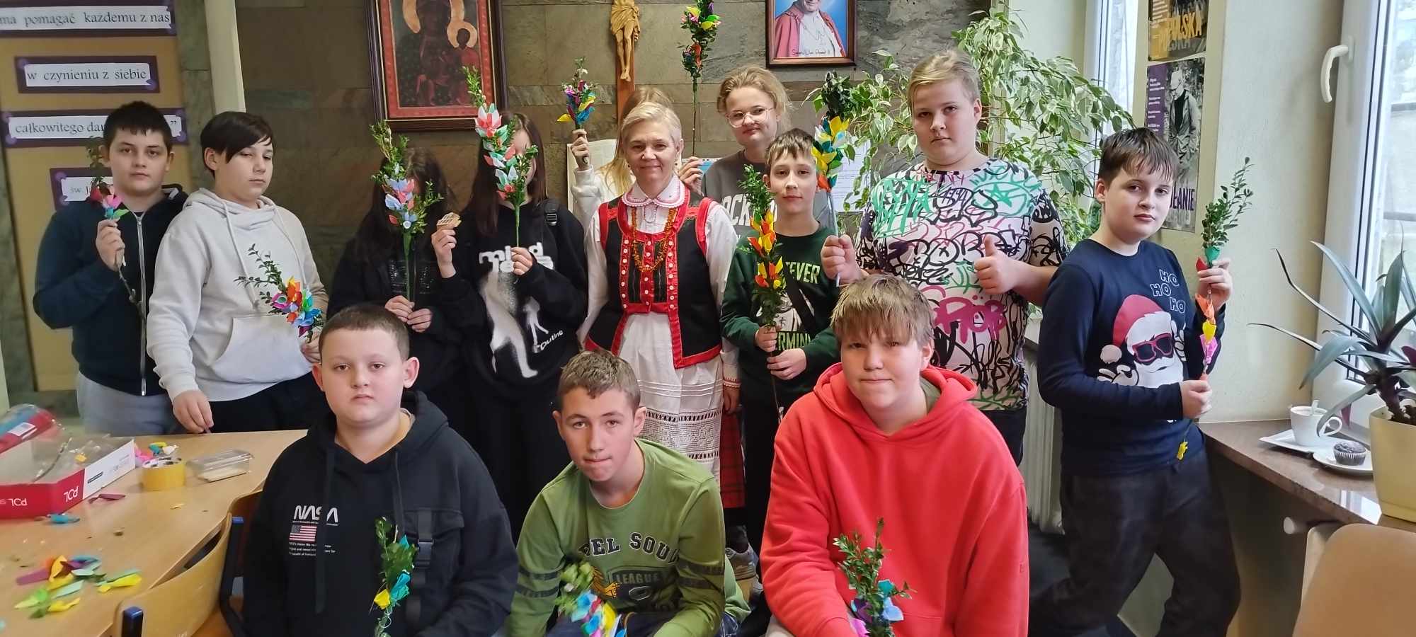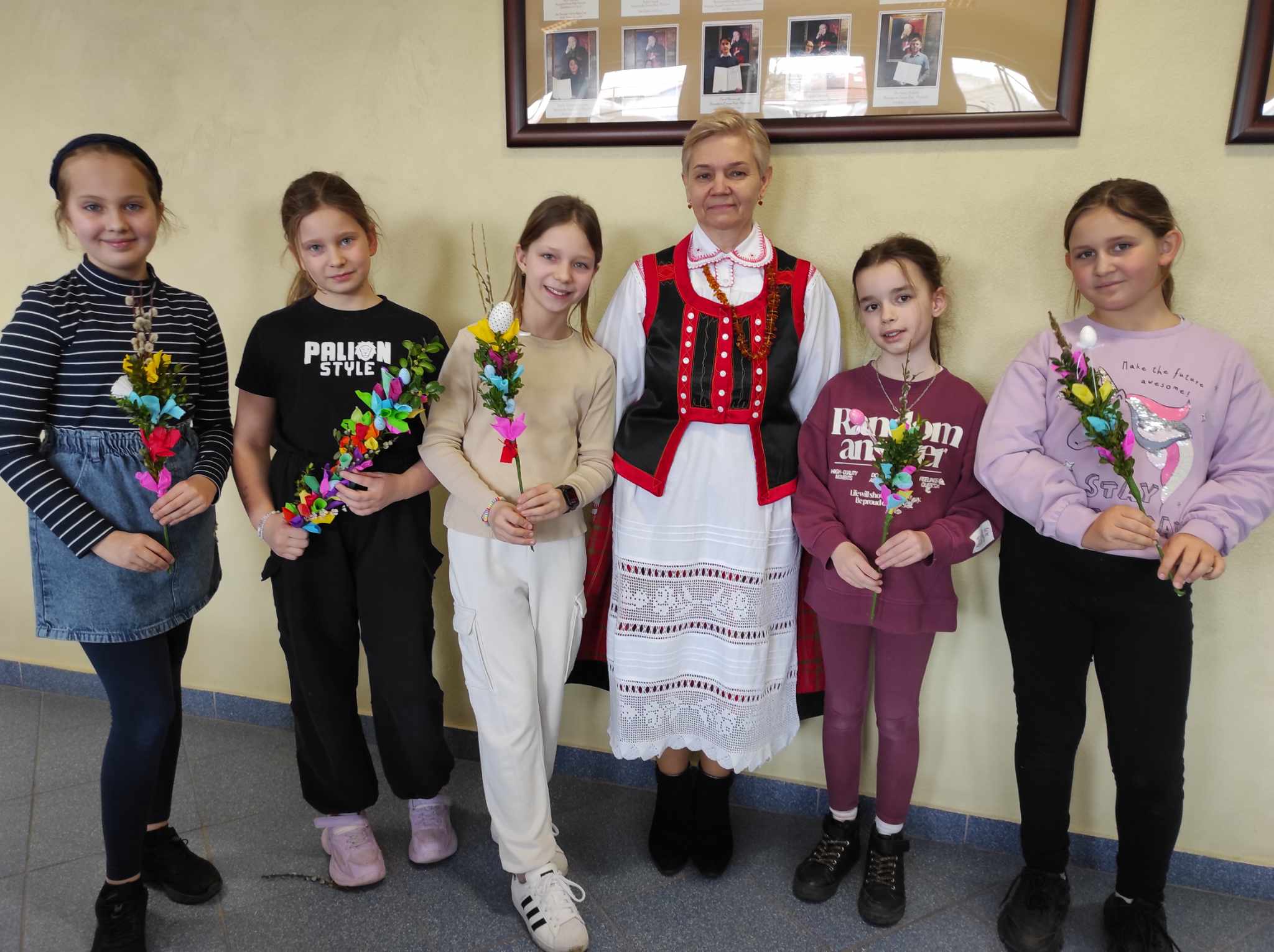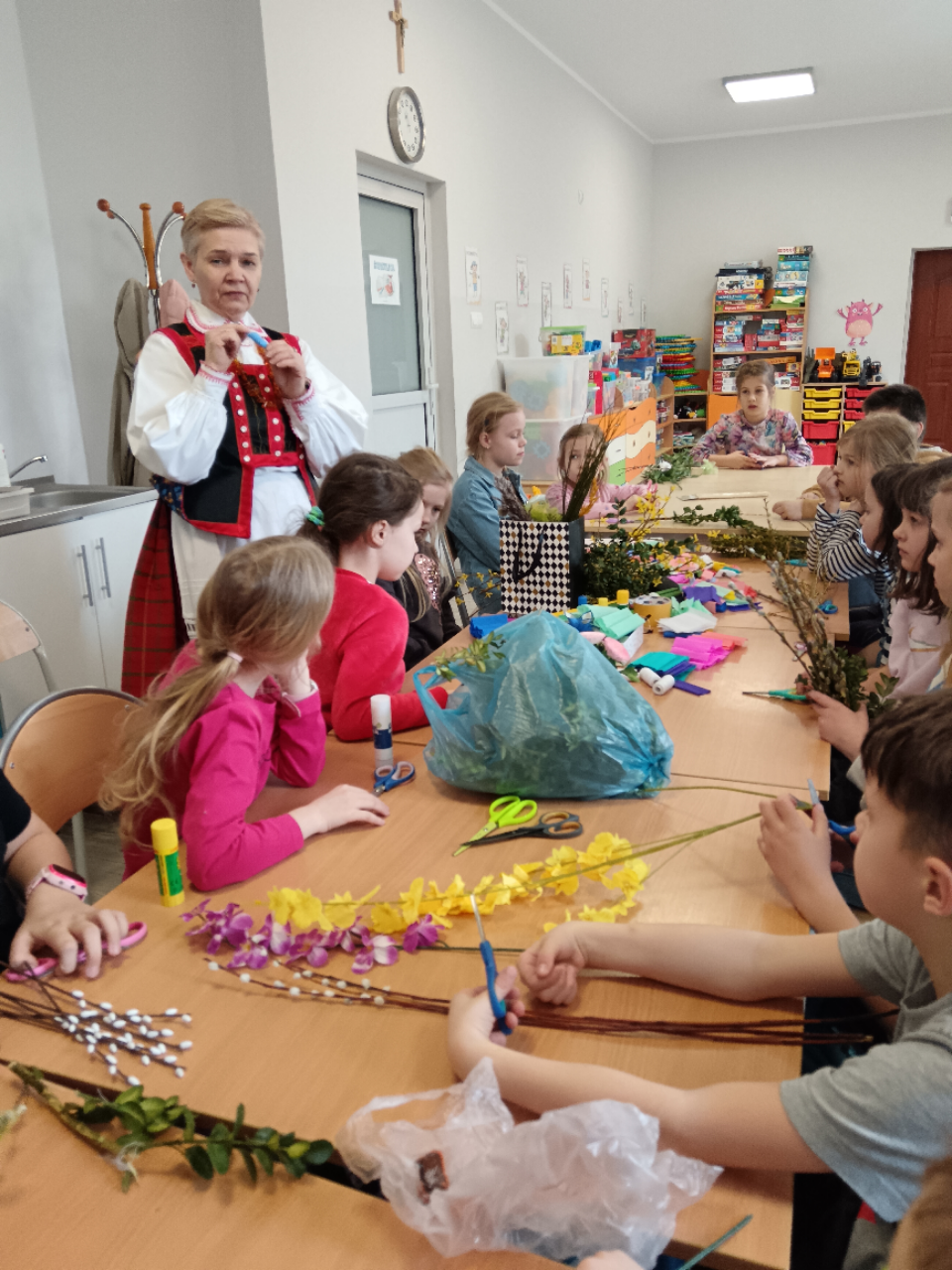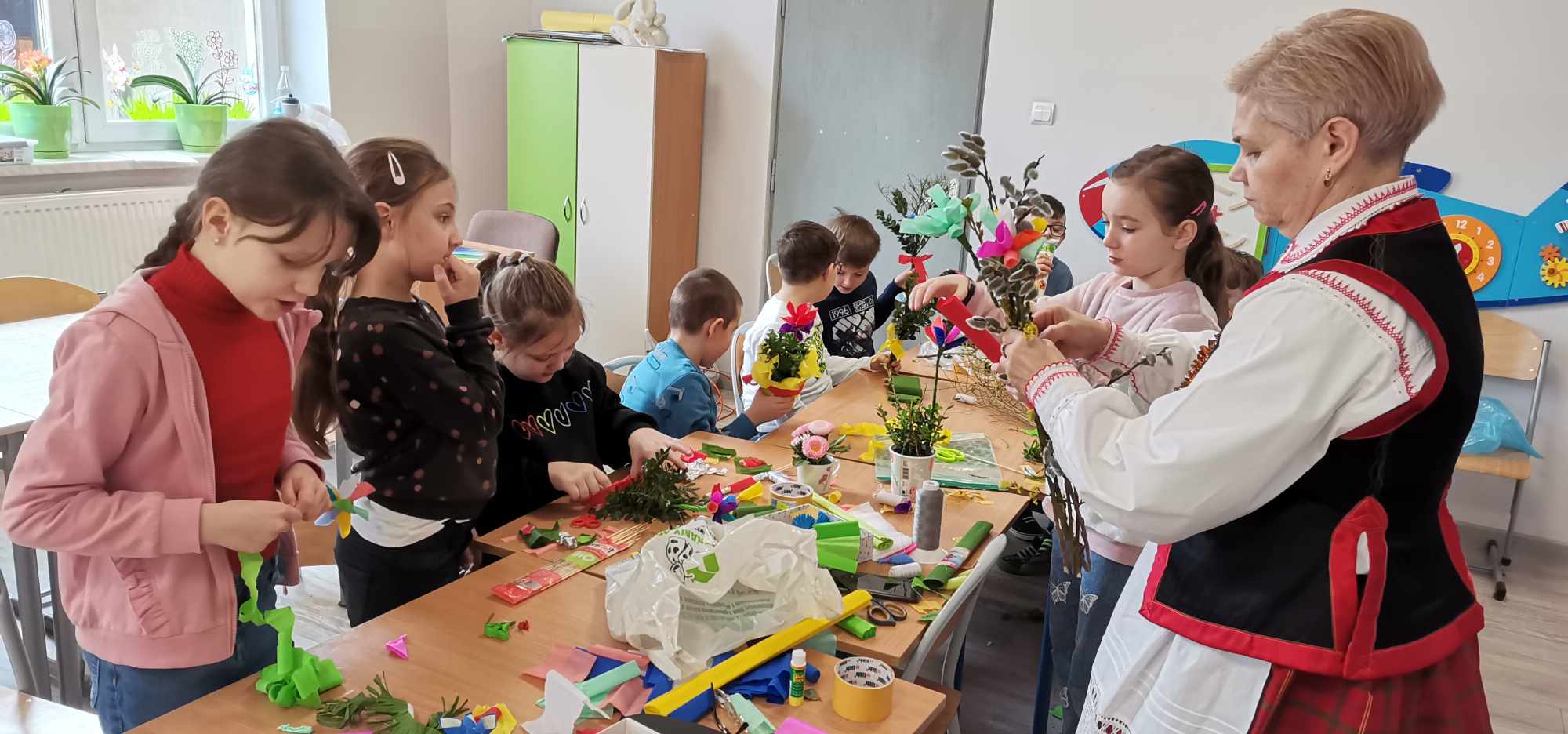 22 i 25 marca 2024 roku uczniowie klas I-III oraz V wzięli udział w warsztatach rękodzieła kurpiowskiego, które w naszej szkole poprowadziła Pani Elżbieta Cieloszczyk – Twórczyni Ludowa „Na patyku zakręcone”. W czasie warsztatów dzieci wykonywały kwiaty z bibuły i krepiny oraz tworzyły wielkanocne palmy i bukiety.
