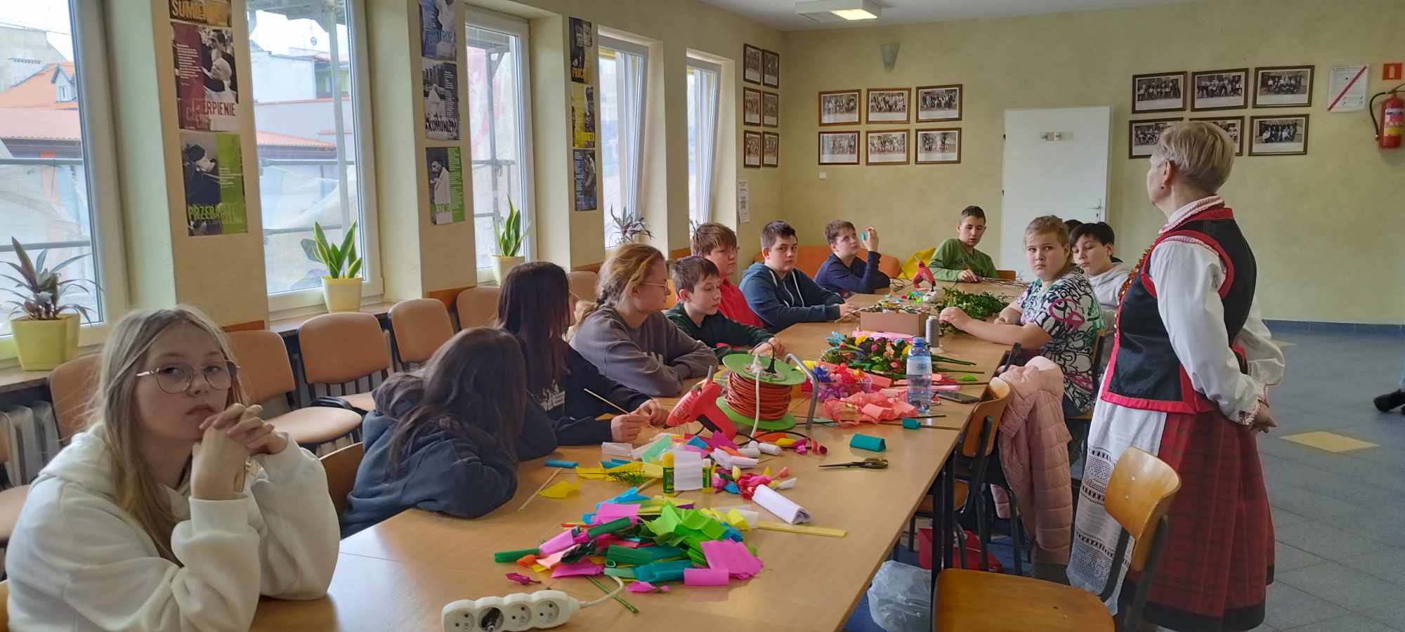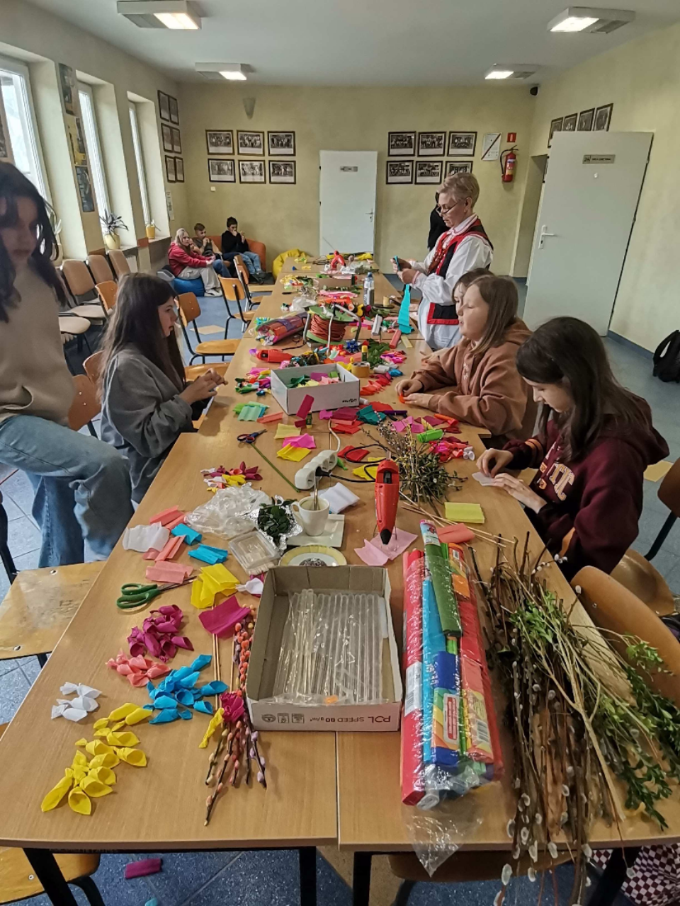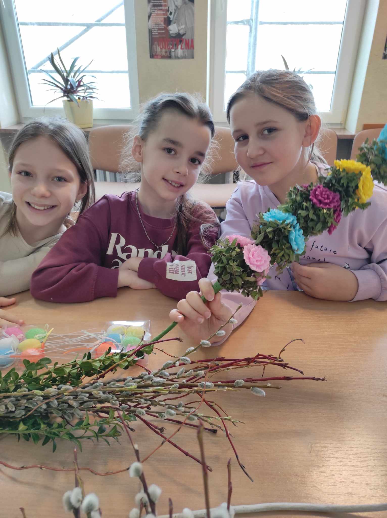 22 i 25 marca 2024 roku uczniowie klas I-III oraz V wzięli udział w warsztatach rękodzieła kurpiowskiego, które w naszej szkole poprowadziła Pani Elżbieta Cieloszczyk – Twórczyni Ludowa „Na patyku zakręcone”. W czasie warsztatów dzieci wykonywały kwiaty z bibuły i krepiny oraz tworzyły wielkanocne palmy i bukiety.