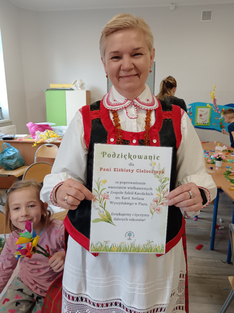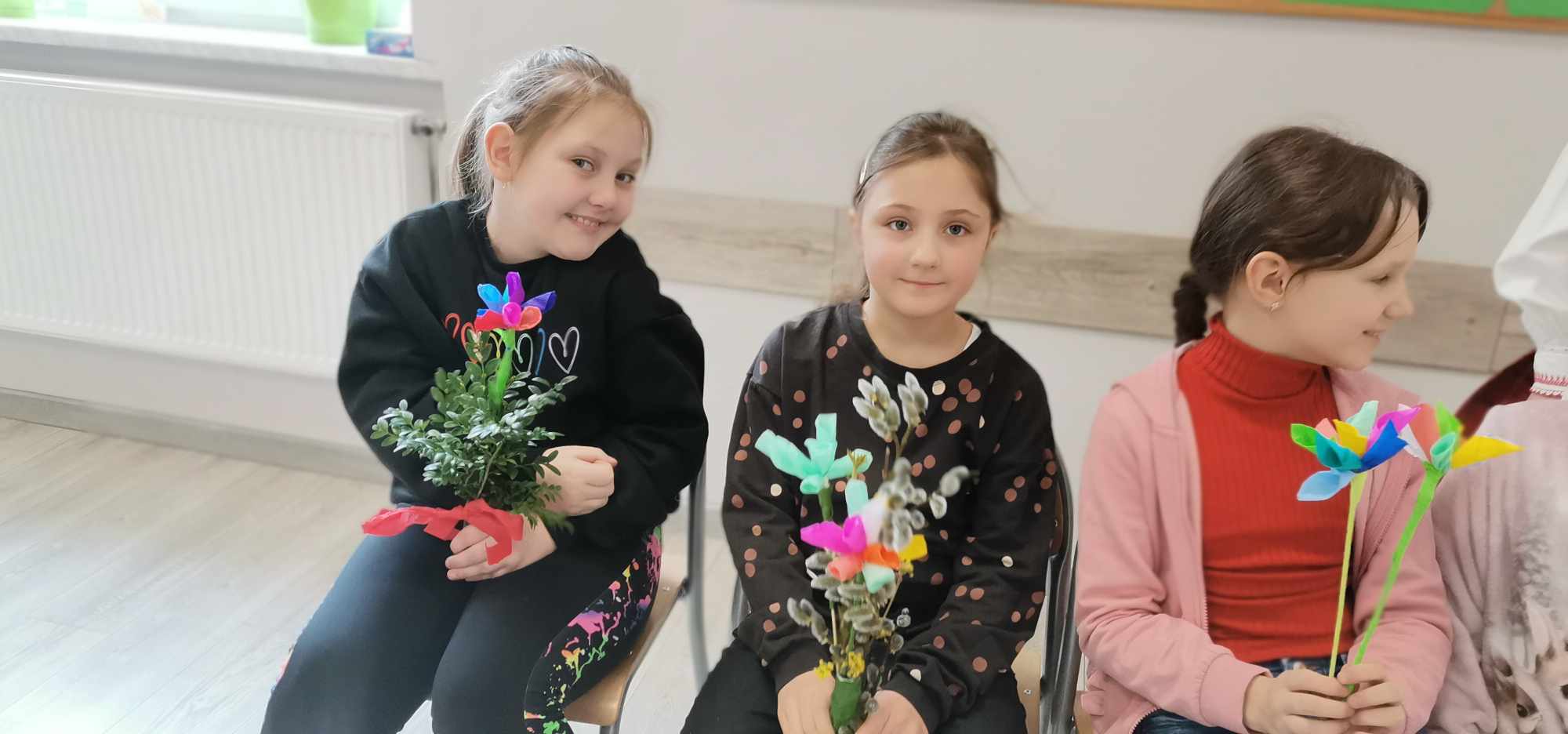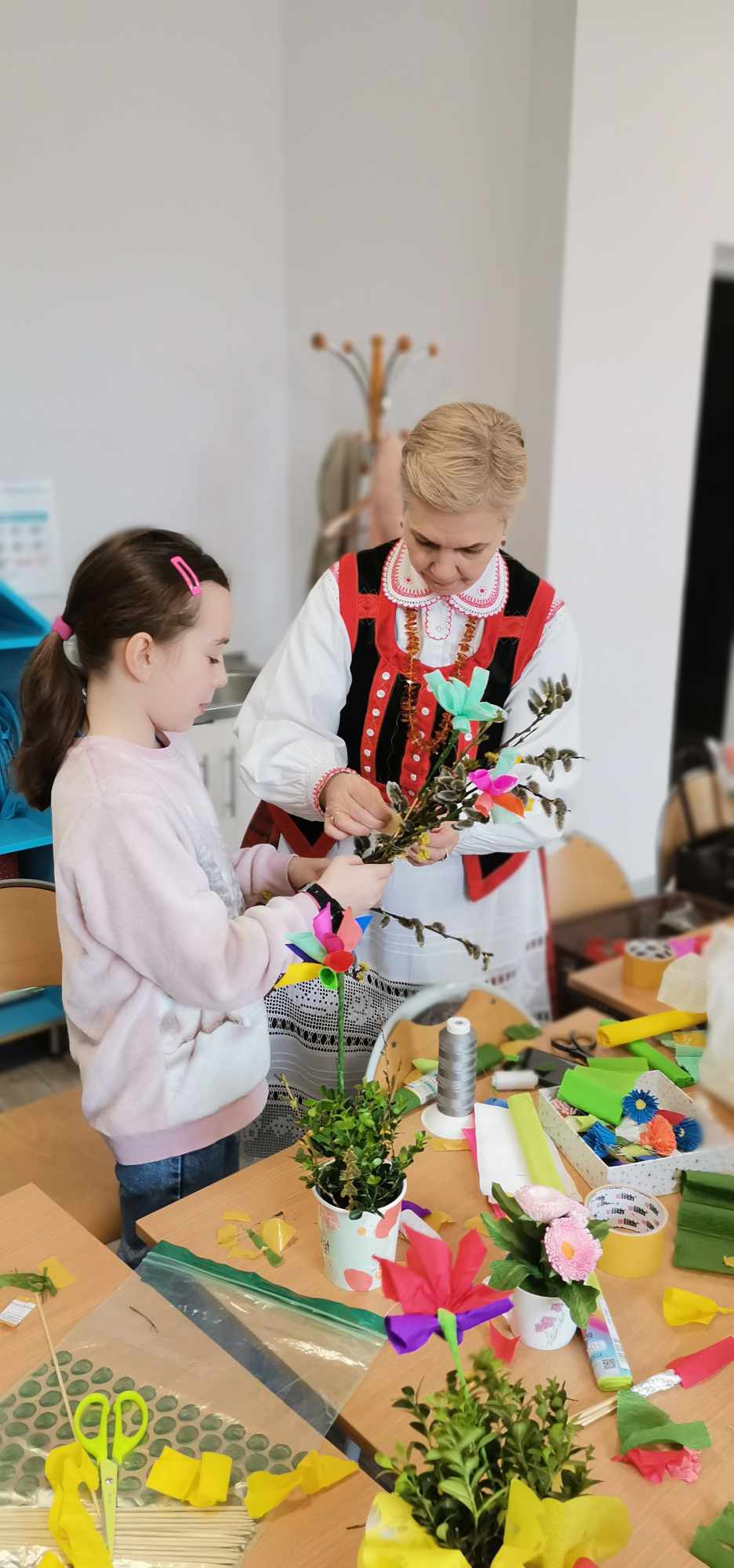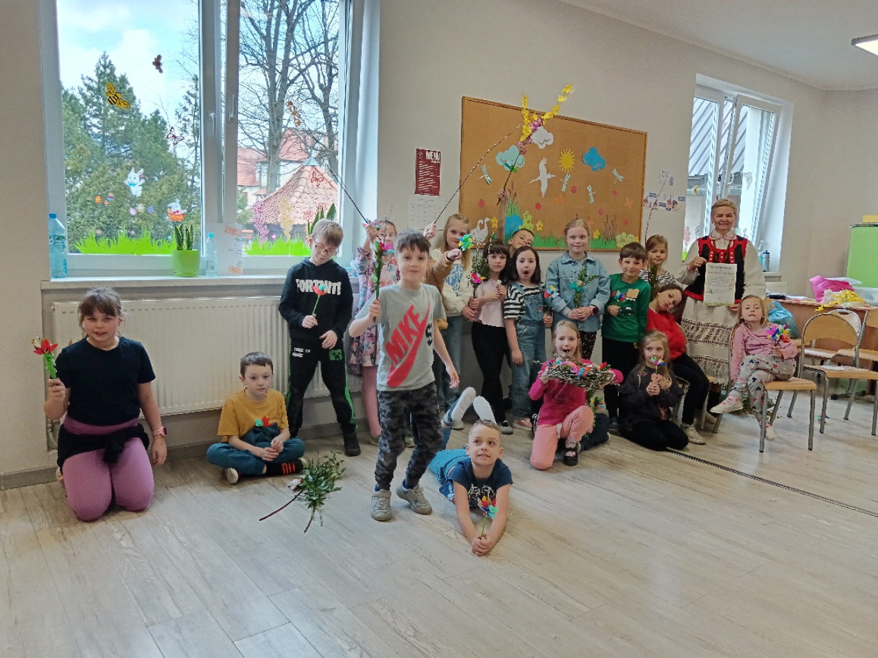 22 i 25 marca 2024 roku uczniowie klas I-III oraz V wzięli udział w warsztatach rękodzieła kurpiowskiego, które w naszej szkole poprowadziła Pani Elżbieta Cieloszczyk – Twórczyni Ludowa „Na patyku zakręcone”. W czasie warsztatów dzieci wykonywały kwiaty z bibuły i krepiny oraz tworzyły wielkanocne palmy i bukiety.